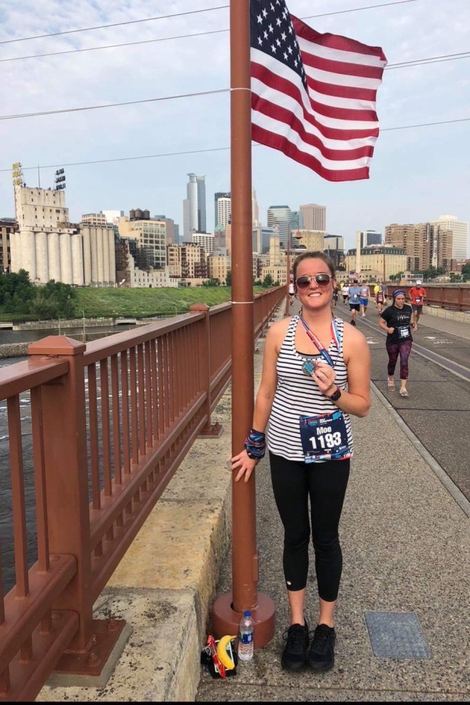 In 2019, she ran both a half marathon and a full marathon. She did the full marathon in Duluth, Minnesota which is notorious for its hills (ahem, 26 plus miles of hills). She wished her marathon time had been better and hoped to do another one in the future. She laughed as she told me about the blister she got and how she had to message her mom to bring her Band-Aids at a certain mile mark so that she was able to finish. She was quick to share, “I always hate the first three miles of any run, it is all good after that.”